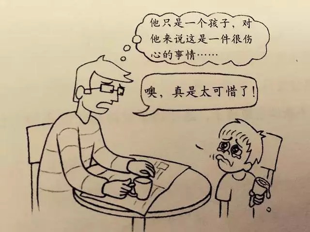 孩子仍然很伤心,爸爸给了更多的同情和理解;爸爸的话,让孩子觉得自己获得了重视和理解,所以悲伤情绪没有加重,而是思考该怎么才能改善目前的情况。