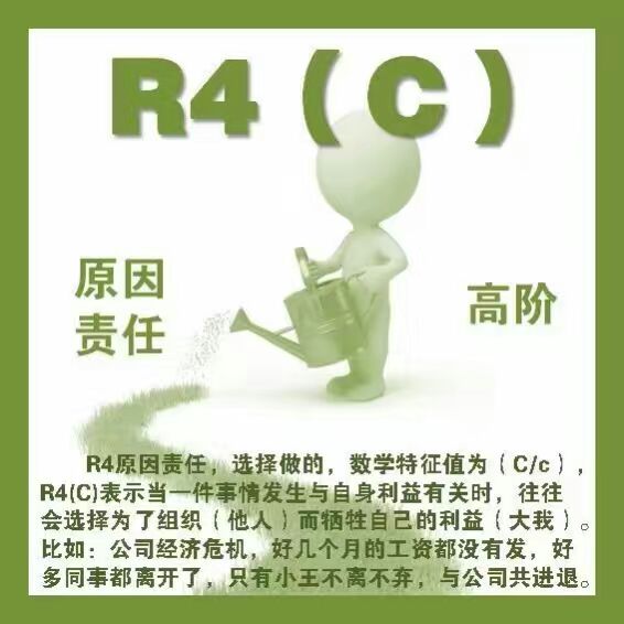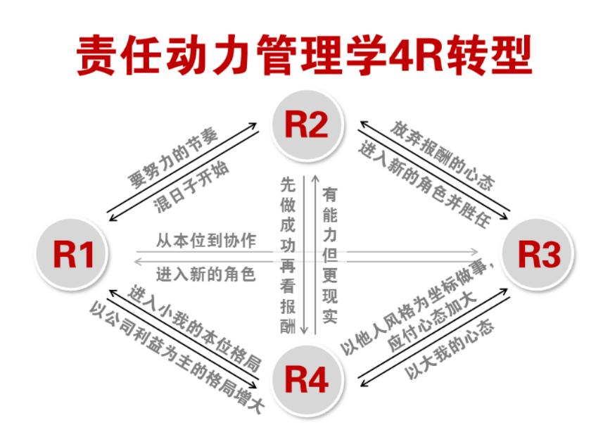 职场第四个阶段的优秀责任动力思维是R2(N)+R4(C)或R3(+1)+R4(C),在高业绩结果或高水平的团队管理基础上,再加上一个大局意识的原因责任R4(C)。
