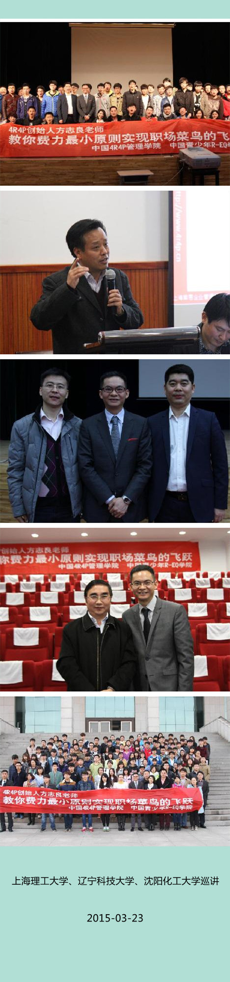 2015年3月23-25日,中国青少年(4R4P)责商学院受上海理工大学、辽宁科技大学、沈阳化工大学三校邀请,为近3000名师生做《理工科毕业生如何费力最小,减少职场责任熵》主题巡讲。