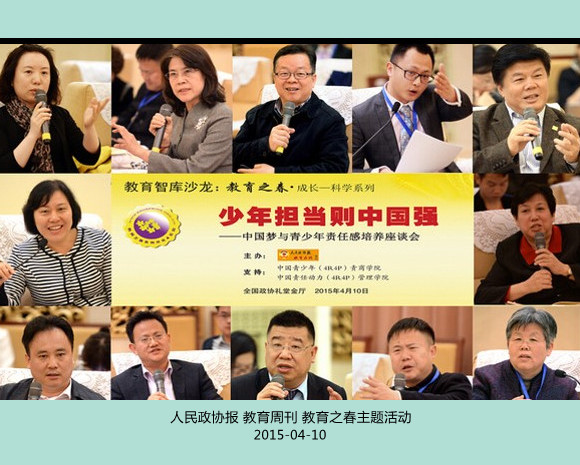 2015年04月10日,《人民政协报》与中国青少年(4R4P)责商学院在政协礼堂共同召开了“少年担当则中国强——中国梦与青少年责任感培养”座谈会,邀请社会各界集智聚力,合理研讨分析、提炼挖掘社会各界在强青少年责任感培养方面的思考、研究成果与实践智慧。