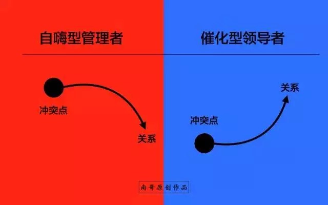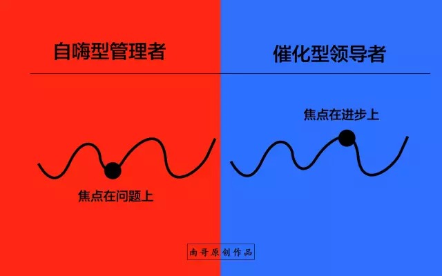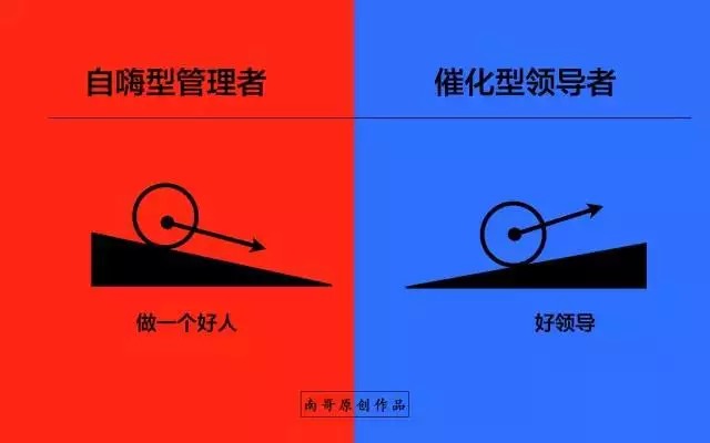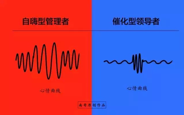 而焦点的不同则心情太不一样,自嗨型的管理者通常是比较情绪化的,业绩好了沾沾自喜,似乎自己就是公司内的大咖,而业绩差或者是员工表现不佳则立刻阴天,真是喜怒行于色,爱憎趋向于明;而催化型的管理者则比较善于控制自己的情绪,且在遇到问题的时候,很少用负面情绪与下属沟通,这在一定程度上体现了管理者的心智成熟度~