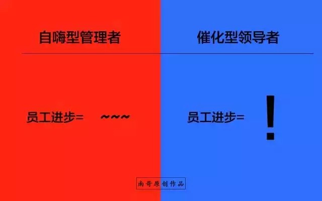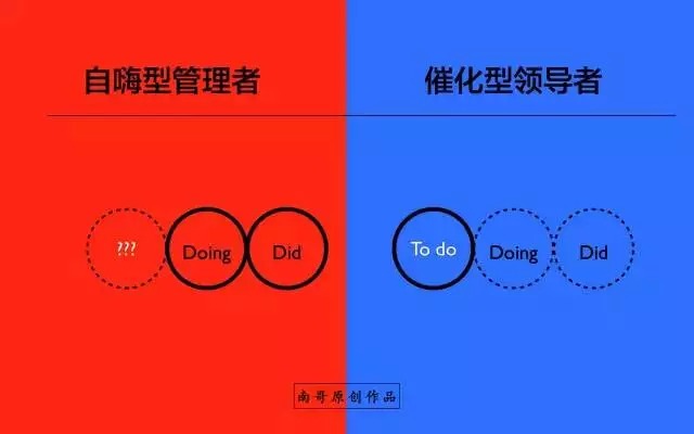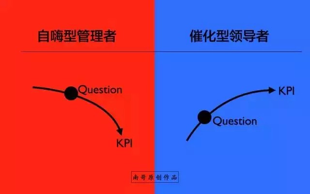 当员工遇到问题的时候,自嗨型的管理者通常会直接告知员工解决的答案,而催化型的领导者则通过简单而有效的提问帮助员工发现问题背后的规律,并培养员工主动思考、主动解决问题的逻辑,在开始可能慢了一点,但是半年后差距就呈现出来~~