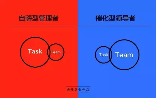 自嗨型管理者是比较常见的,他们最典型的特点就是超级有能力,神马都能干!自己忙得像无头的苍蝇,团队则松散且绩效不高;而催化型领导者则看似轻松悠闲,但是团队非常紧凑忙碌且团队整体绩效比较高。