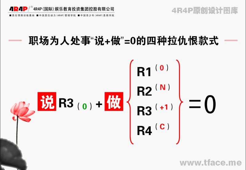 这就是我们常说的“他这个人做事倒很考虑大局观,就是不会说话,一说话就得罪人,噎死人!”,构成R4(C)+R3(0)=0,一高一低等于零,不但没有敬佩反而招致仇恨!