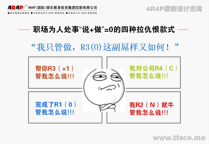 4R4P分析:很多公司普遍存在这种责任现象,有些部门负责人做事能够以公司大局为重,但在处理公司与部门人际之间的沟通“说”中,明显存在抬高公司,贬低团队的语言做法,最终导致团队内部不和谐。