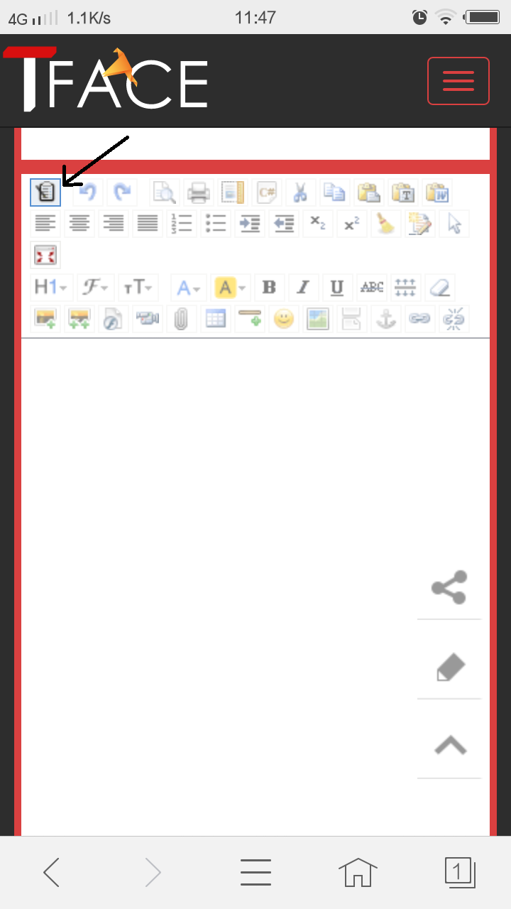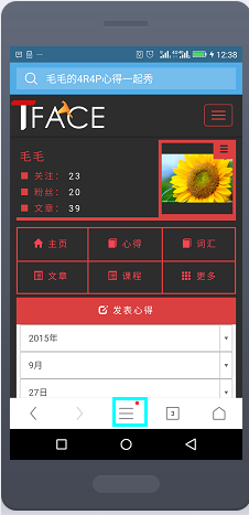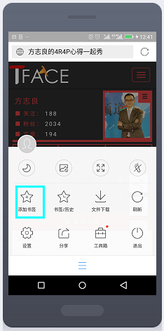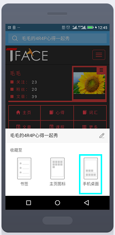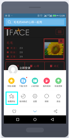 打开你的浏览器,我们登陆了Tface以后,不管你是想以后一键进入写文章,还是一键进入写心得,我们只要打开你想快速进入的界面,点击浏览器下方菜单图标,进入“收藏网址”,然后选择“手机桌面”就好啦! 如图: