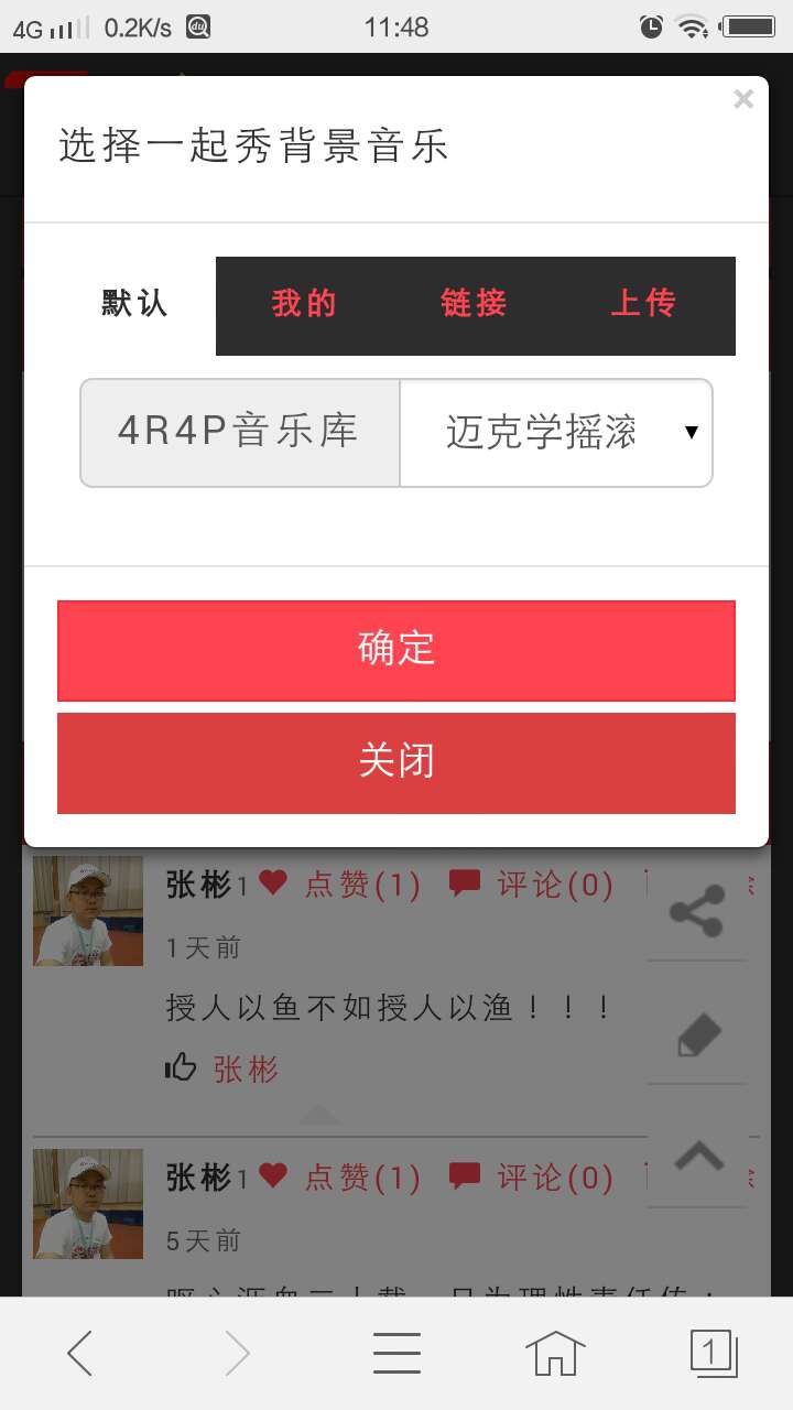 这里是4R4P音乐库,可以选择系统提供的音乐,同时也可以上传自己喜欢的音乐,选择好之后点击确定。这样自己的心得就发表了,然后点击“一起秀”,自己的心得就会出现,紧接着将心得分享出去,小伙伴们就会看见你的心得了!!