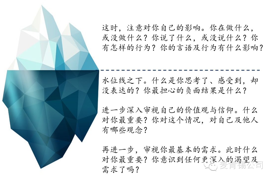 除了“战斗、逃跑或惊呆”的反应外,是否也可以暂停一下,反思并有创造性且高效地管理你的情绪?这里有个方法:回想一件最近发生且仍然让你情绪波动的令人沮丧的事情。当时,你并非处于最佳状态,你感到害怕与愤怒,并伴有不适的生理反应:心跳加速,胃部不适甚至恶心反胃。现在回想一下当时的情景。同时,记住冰山一角的比喻,水面上可见的仅仅是一小部分。