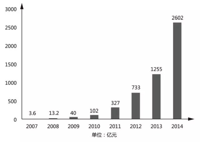 在众多电子商务企业当中,京东发展壮大的过程,给人历久弥新的印象是:无论在哪个发展阶段,无论融多少风险资金,京东一举一动的出发点和落脚点都鲜明地体现出了要为用户创造更多价值的信念。成立于2004年的“京东多媒体”网站,于2007年获得1000万美元风险融资后,更名为“京东商城”。随着销售规模不断突破,业务类别向着生活、旅游等服务业扩张,物流和金融业务也发挥了越来越重要的作用。2013年,京东商城更名为“京东”。从2004初创年份的1000万元交易额裂变式地增长到2014年的2602亿元,即便是全世界范围内的B2C 网站,也鲜有10整年下来保持着平均每年超过150%的复合增长率者,如图7-4所示。