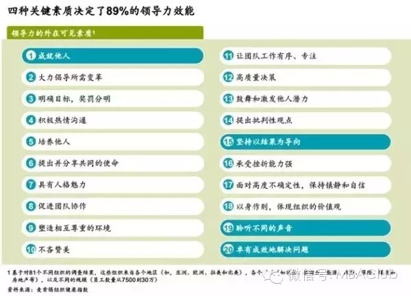 好消息是,我们最近的研究表明,有几项素质与卓有成效的领导力存在明显的相关性,在基层管理者当中尤为如此。基于实践经验和大量相关学术文献研究,我们总结出了20项领导力的外在可见素质。接着,我们对世界各地81个组织的18.9万名受访者进行调查,评估某些类型的领导力素质在他们的组织里出现的频率。最后,我们根据领导力表现的强与弱对接受评估的组织进行分组。