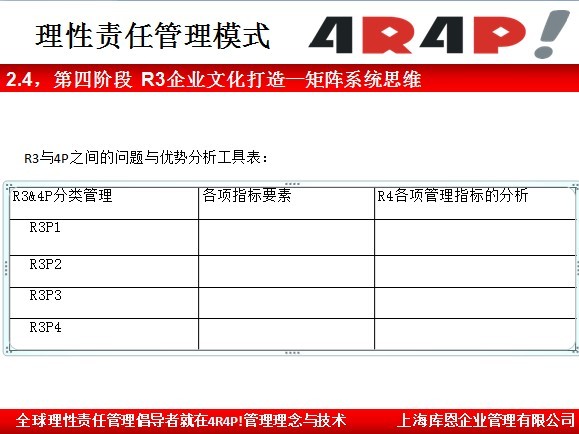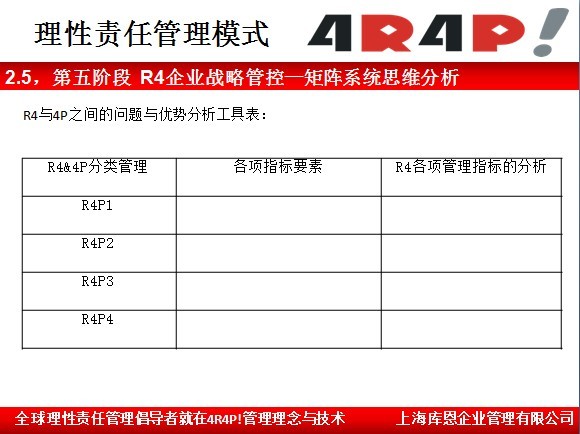 4R4P矩阵系统思维是基于理性责任的四个维度开发出来的一套管理思维训练工具。其适用于任何企业主、企业高层和企业中基层人员,对管理者的管理水平能够起到积极提高和改善的效果。
