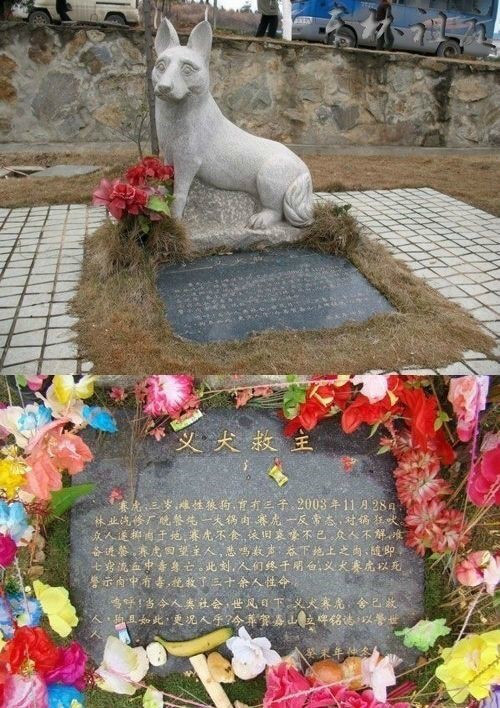 2、三十多个职工在煮一锅被毒死的狗的狗肉准备吃,赛虎嗅出了肉里有毒,拼命吠叫阻止人们去吃,但人们不明白,以为狗想吃肉,就扔给它几块,但赛虎不吃,还是不停吠叫,甚至开始哀嚎。最后,在人们要去吃肉时,这只狗狗流着泪,一声悲鸣,吃掉了地上的肉,当场中毒而死。九江市贺家山陵园总经理听说后非常感动,把赛虎移葬到贺家山陵园,为这只舍身救人的义犬建造了雕像。移葬那天,有一百多人冒雨自发为赛虎送行……