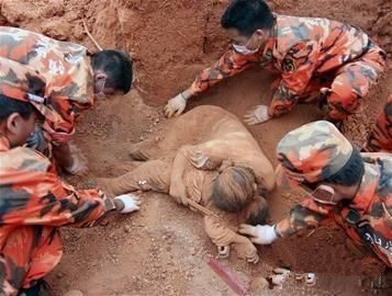 5、正在吃饭的母亲,在地震袭来的瞬间,用自己的身体护住了一旁的女儿,连手中的筷子都没来得及丢掉。无情的地震夺走了母女俩的生命,但当消防官兵把她们从废墟中刨出来时,她们僵硬的身体依旧保持着紧紧相拥的姿势,在死亡的最后一刻,母亲依旧保护着她的女儿……