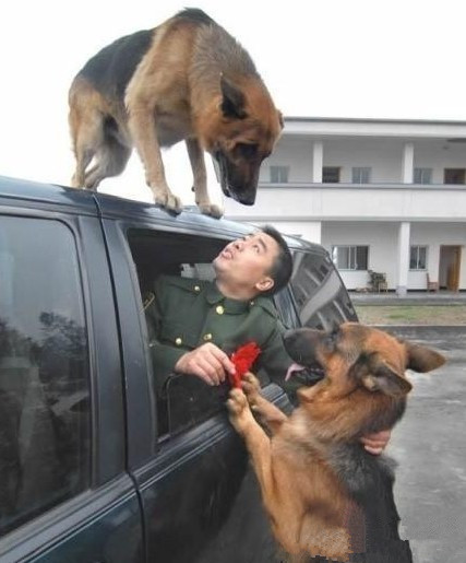 11.这个叫小鲁的战士退伍走的那一天,他一直训练的警犬“待发”和“大海”一直拉扯他的行李,不让他走。好容易坐上车了,“待发”突然蹿上车顶,“大海”扑车窗狂叫,车只好停下来,连司机都哭了!
