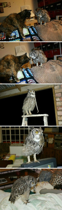 12、【猫头鹰的报恩】一位好心人4年前救了一只受伤的猫头鹰,让它在家养伤2个月。结果猫头鹰康复后,竟每天去捕捉老鼠、蛇等给家里的猫,甚至还有主人的份。这一报恩一直持续到了现在,已经有4年之久。