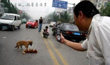 13、这组图片曾在网上很风行,一条小狗受了伤,另一条狗一边护住它,一边向人类求助,现场很多人驻足围观,感叹、拍照、上传上网,展示狗们互助友爱的精神。此事被日本媒体转载后引起了日本社会普遍的愤怒和嘲骂,认为在场中国人缺乏同情心,没有爱心……网络为此展开调查,大约七成网民接受批评。