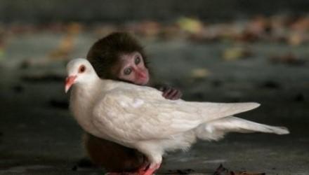 16、一只与妈妈走失的小猴子,对这个世界既充满了恐惧,又满怀着希望,它深情地拥着白鸽,体验着这个世界;白鸽没有害怕和抗拒,它用接纳回应着这只孤独的小猴子。爱无疆,谁说过爱只存在于人类?
