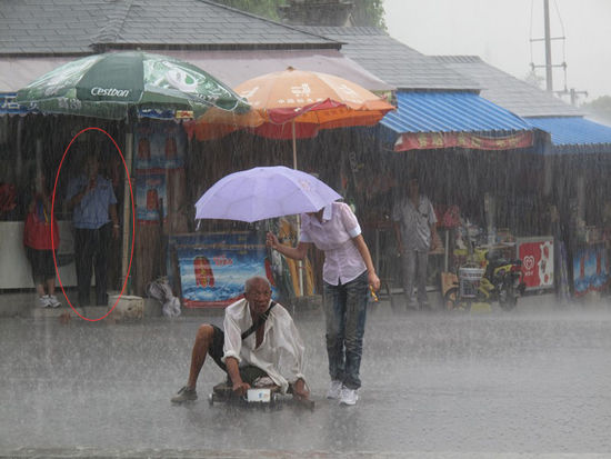 18、女孩暴雨中为残疾乞丐撑伞,制服男正在一旁观望。