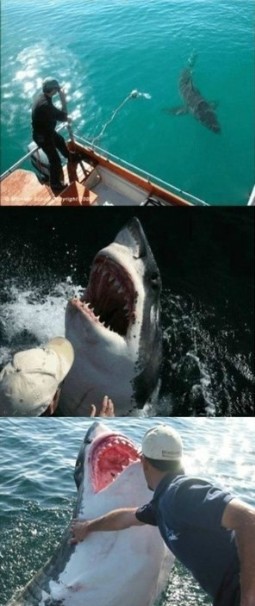 19、自从他两年前放了跑进鱼网中的大白鲨,以后不管他去哪儿,这只大白鲨就一直跟着他。还吓跑了其它鱼。他都不知道该怎么办才好,有一次他停下来,这只热情的大白鲨就向他游过来,还把肚皮跟脖子给他摸摸,凝视着他对着他露齿大笑。。。