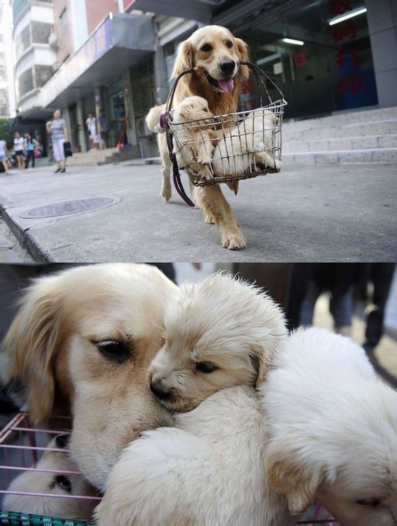 26、2010年8月18,深圳,金毛犬贝贝按主人要求,叼着自己的三个孩子去卖。贝贝特别懂事,主人去买菜,它蹲在旁边等,等菜放在篮子里,它就帮主人叼回家,还会在下雨时帮主人叼伞,会把垃圾摆在门口,只要主人一声招呼,就把它们叼到垃圾筒里。贝贝知道要去卖孩子,这不是第一次了。路上,3只毛茸茸的金毛宝宝在篮子里打瞌睡,能叼27斤的贝贝几次停下来,在狗市,面对讨价还价的人,贝贝知道又要和孩子分离了…