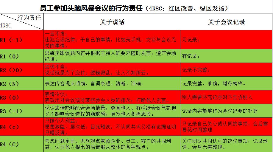 昨天我组织部门人员召开了一个关于制度完善的讨论会,希望运用头脑风暴的方法来获取更多的智慧,会议进程中有的发言、有的不发言,有的激情、有的则安静得让人着急,会议结果没有达到我的心理预期。记得方老师有篇文章提到,只有区分行为责任才能便于管理。于是根据4R8C的逻辑思维,我试着列举了一下各种行为责任,以期指导与会人员。