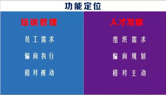 一是从组织需求出发规划促进人才发展,转换功能定位。传统的培训管理是针对员工采用各种方式进行有目的、有计划的培养和训练;人才发展是综合运用培训与发展、组织发展和职业发展等手段来提升个人和组织效能。可见,传统的培训管理主要满足员工成长需求,是偏向于执行层面的工作。而人才发展主要从组织需求出发,系统规划人才发展战略。