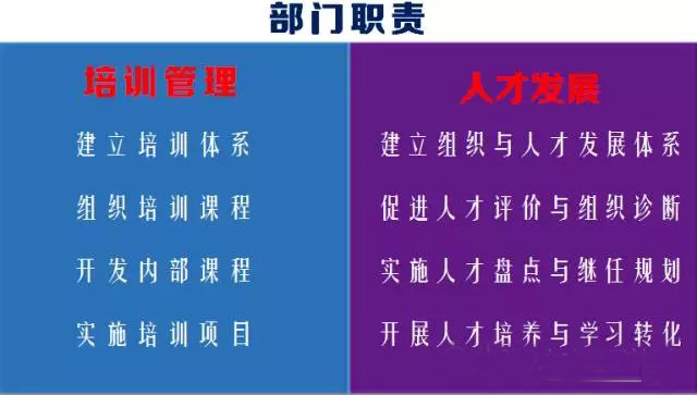 二是建立和完善组织与人才发展体系,升级部门职责。传统培训部门的职责是根据公司的总体战略建立和完善培训体系,制订、组织、落实企业培训计划;开发内部课程,培养内部讲师等;而人才发展部门应从关注培训行为到关注人才管理体系化,将人才发展与组织效能对接,具体职责是根据组织发展和人才标准建立和完善人才发展体系,促进人才评价与组织诊断,开展人才盘点与继任规划,实施人才培养与学习转化。