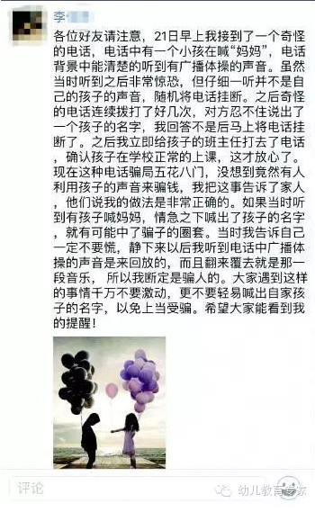 据说这是电话骗子的最新骗术,各位爸妈尤其要警惕。无独有偶,最近也有其他家长类似的警示: