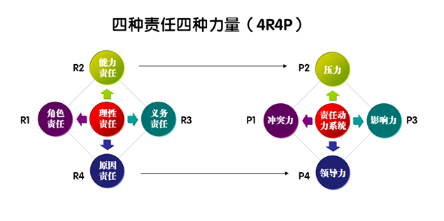 “4R4P”中的4R表示人的四种不同责任概念区分(R1角色责任、R2能力责任、R3义务责任和R4原因责任的英文简称);4P表示管理中的四种基本力量(P1冲突力、P2压力、P3影响力和P4领导力的简称)。