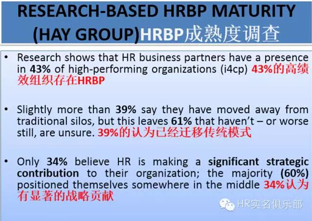 1、国外情况:43%的高绩效组织实施这个HRBP模式,同时,有34%的组织认为HRBP有显著的战略贡献,HRBP模式还没有人人称道的地步,毕竟它只有十几年的发展史。