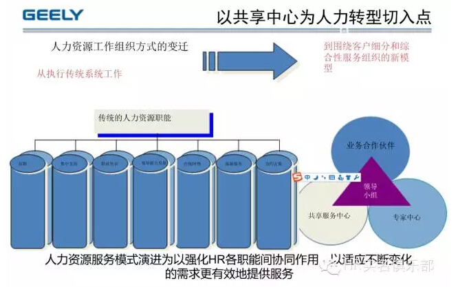 2、共享模式:以SSC为切入点,以吉利汽车为例,强调协同性,要求三支柱(HRBP、SSC、COE)之间协同并进,动态去解决问题,为了解决协同问题,在三支柱之上,保留一个领导小组。