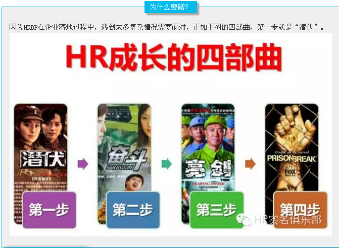 因为HRBP在企业落地过程中,遇到太多复杂情况需要面对,正如下图的四部曲,第一步就是“潜伏”。