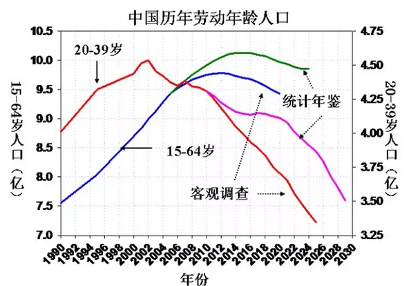 上图:中国劳动力人口衰退趋势