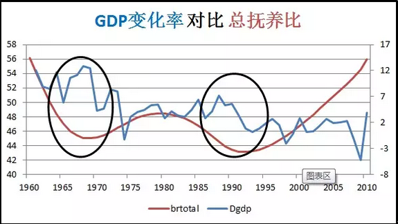 上图:日本总抚养比与GDP之间的关系。蓝色为GDP,红色为总抚养比。在低抚养比的两个时间段,日本经济表现都很好。1995年之后日本抚养比一直没有下降,日本GDP发展也是长期低迷。(总抚养比 =(老龄人口+未成年人口)/ 劳动力人口)