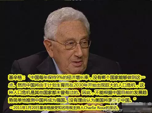 上图: 早在中国经济还坚挺的2011年,基辛格就淡定的告诉美国人不要担心中国崛起。为何?因为他就是国际计生运动的主要策划者!基辛格现在应该如释重负了,因为他早在三十多年前就通过联合国人口基金会怂恿资助“计划”中国的人口而将中国的崛起“计划”掉了。