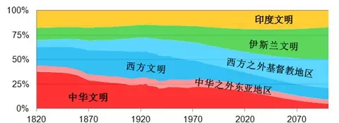 上图:世界主要文明人口相对比例的变化趋势(1820-2100年)