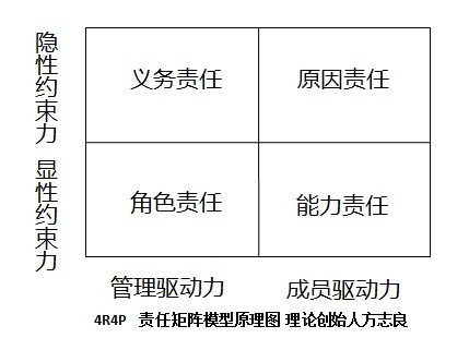 4R4P最核心的责任理论研发成果介绍---责任矩阵模型,该模型是方志良先生通过长达10年的责任深入研究得出的严谨、科学的责任数学建模。开创了全球责任管理体系的理论基础。如下图: