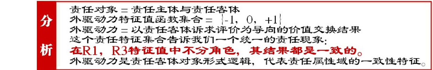 内外驱动力的责任对象范围不可混,内心想做的事不代表内驱动行动,很多都是外驱动,隐性约束力条件下的事情。两者一定要从责任主客体对象区分。当这种行为从外部环境要求做进化到其内心,成为一种内心驱动自己认为应该做,而且得努力做好时候,就是从角色责任高阶R1(0)走过了能力责任高阶R2(N),到达了义务责任高阶R3(+1)。(识别行为的外部显性环境要求做,进化到能够判断(责任客体)隐性环境对自己的诉求,到达了义务责任高阶R3(+1);识别显性需求下的内心驱动的努力做好时候,就是从角色责任高阶R1(0)走过了能力责任高阶R2(N)。)