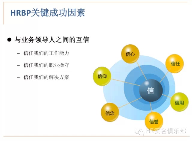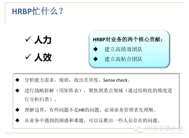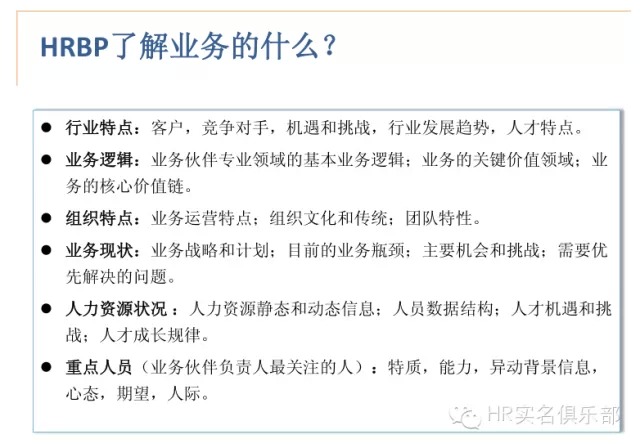 HRBP是一个中立的伙伴角色,在HR的专业知识基础上帮助业务经理看到人力资源管理上的问题, 提供一些专业的有针对性的建议和解决措施, 提升业务单元人力资源管理能力。 千万不能只是一味没原则地服务, 要有管理职能和战略眼界。