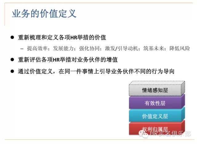 另一方面,HRBP专业程度和影响力不够,不能以自身的专业发现业务战略问题以及提出建议,不能得到业务部门的信任,从而不能够影响业务部门有效战略的制定和推行,也不会考虑整合定制一些HR服务来满足业务部门的需求。