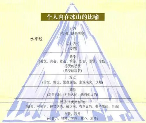 按照冰山理论,我们人是多层次的,表现出来的是行为和相应的应对姿态,这些大家能够看到。而行为背后有感受,再往深层次看,背后还有观点、期待、渴望、自我。在深层的自我层次,人类是共通的,都有自我实现的需求。