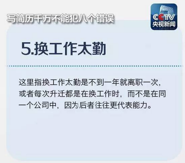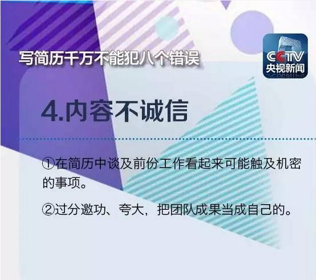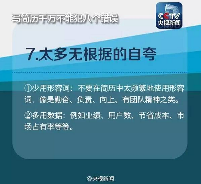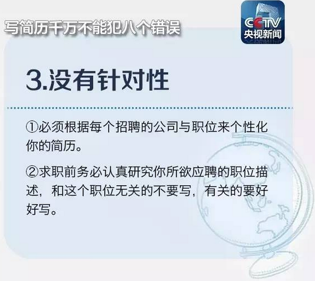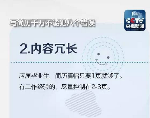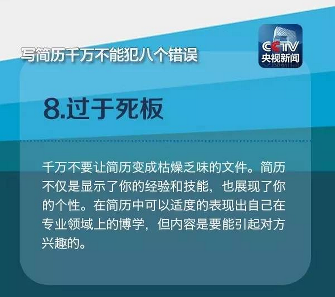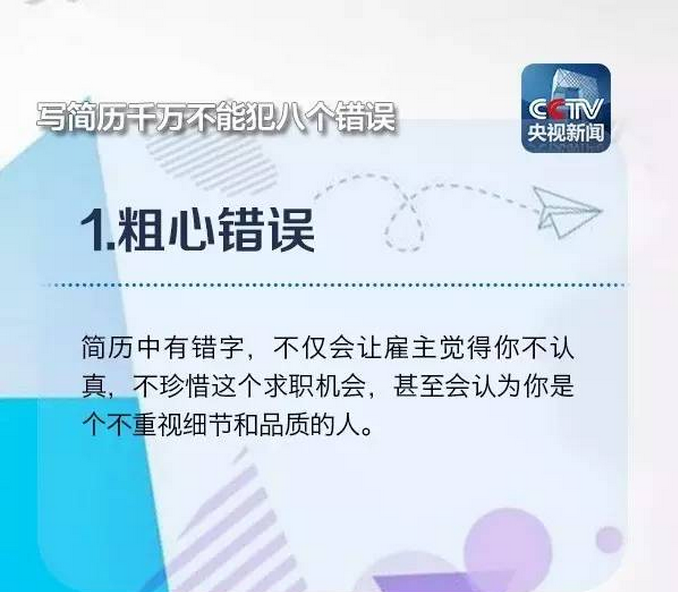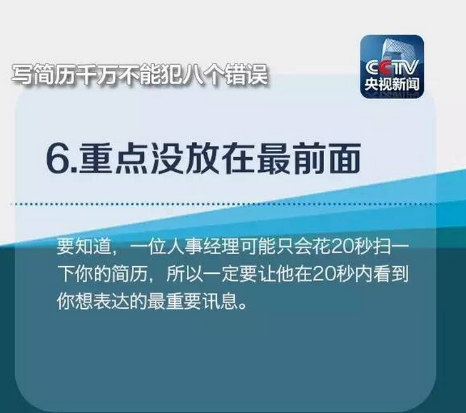 在浙江某招聘会上负责“会诊”的王老师表示,一个熟练的HR浏览简历的时间只有十几秒,只与你交谈几句。因此,减少简历上突出的明显问题,避免出现无用信息掩盖重要信息、排版倾斜45度、夸大自己能力等“奇葩”简历的情况。注意到下列常出现的8大错误,也许就能让你的简历脱颖而出!