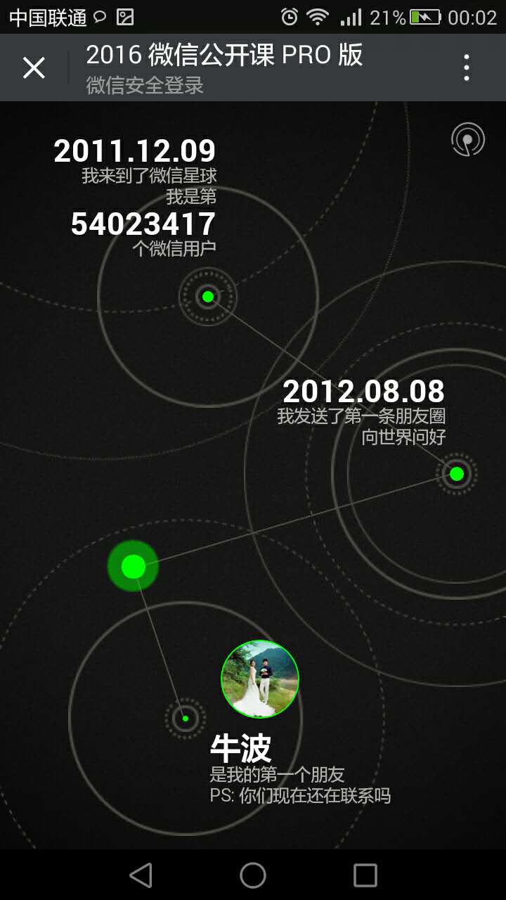 数据最终是要以文字为载体来呈现的,PRO版虽然是一个仅有短短几十个汉字的文案,却能深刻体会到项目组在每一个文字上是下了功夫的。展开第一页就弹出“2015年过去了,我们很怀念他”,简单朴实的一句话却最能直击人心,并且这一句话就直接将用户带到了情景中,再看第一位认识的朋友下面“PS:你们现在还在联系吗?”,立刻将每个人的思绪拉回到并不遥远的一年前,相信这句话能够引发很多人的共鸣,然后去主动联系这位微信上的第一个朋友,如果看到别人晒出的图片上自己是别人的第一个微信好友,想必那一刻的心情用一个简单的愉悦是形容不了的吧?于是乎,许久未曾联系的两个人籍此寒暄两句,聊到深处打个电话甚至约个下午茶或周末饭局都是不无可能的。发送第一条朋友圈的时间“向世界问好”,把每个鲜活的个体放大到整个世界,所有人发的任何一条微信就变得不再是个体行为,而成为与这个世界有交互的社会行为。每一条数据对应的文字都让人感受到一种情怀,这份情怀已经超越了一个聊天工具的属性,已经超越了互联网的边界,将一个简单的分享行为格局放大至无远弗界,让一次简单的分享行为变成了用户之间的再次连接甚至是深度连接,为用户连接网赋予了情感的色彩。