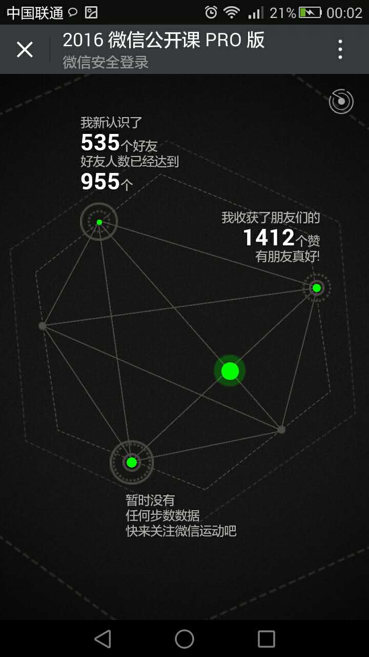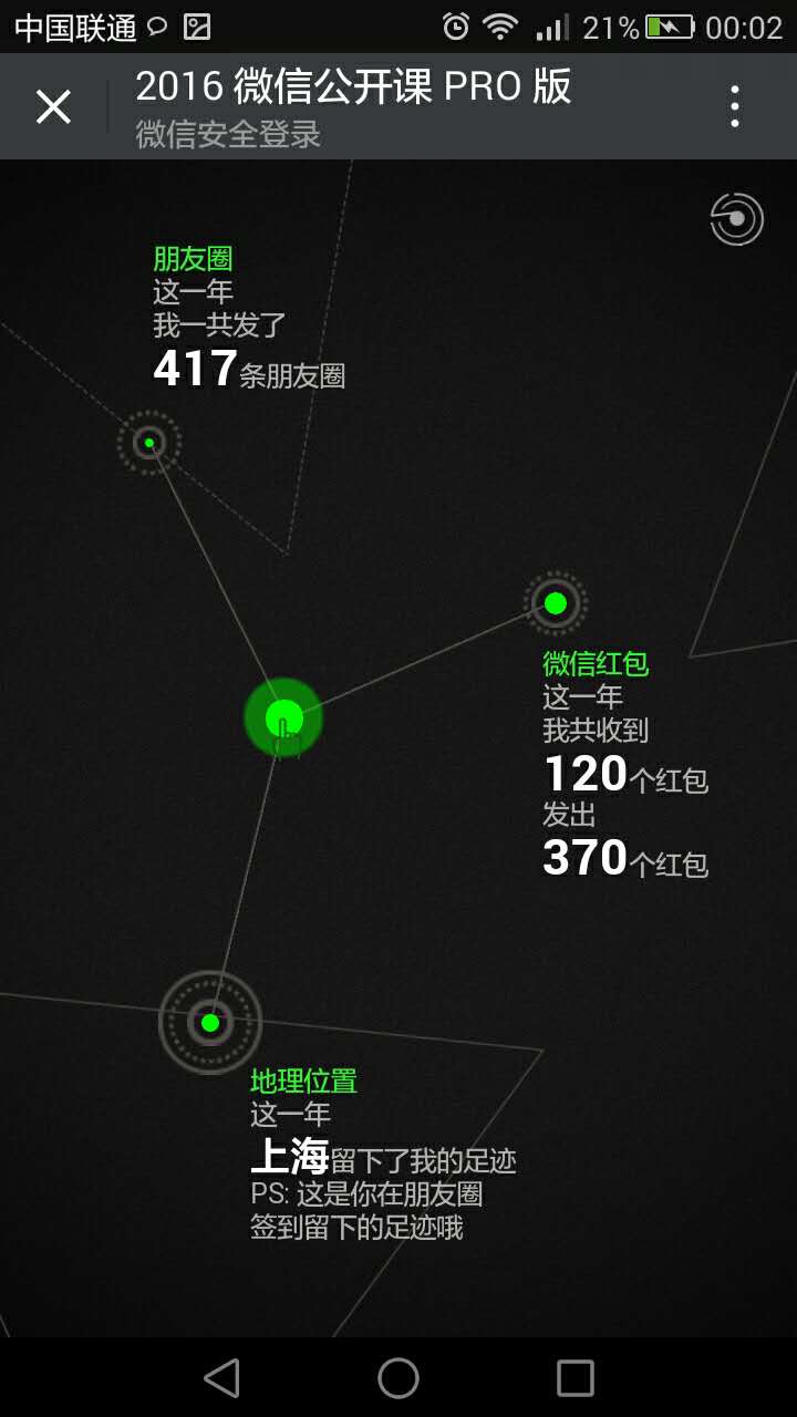 昨天晚上,微信公开课PRO版刷爆整个朋友圈,如果不点开看一下还以为自己朋友圈的朋友全部去炒股了,整个朋友圈一片飘绿。而实际上这是腾讯为1月11日微信公开课PRO版(以下简称PRO版)准备的官方体验活动,参与用户可以了解“我和微信的2015”的故事,也是为了纪念已经成为过去的2015年。