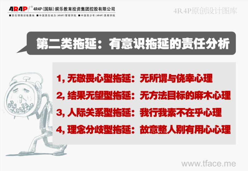 无敬畏心拖延就是总结起来就是利用各种职场个人阅历或业绩能力等优势资源来故意藐视、对抗公司制度以及领导人的威信,最终迫使公司部门制度规则失效,以及让上级的命令、指示失去权威性。