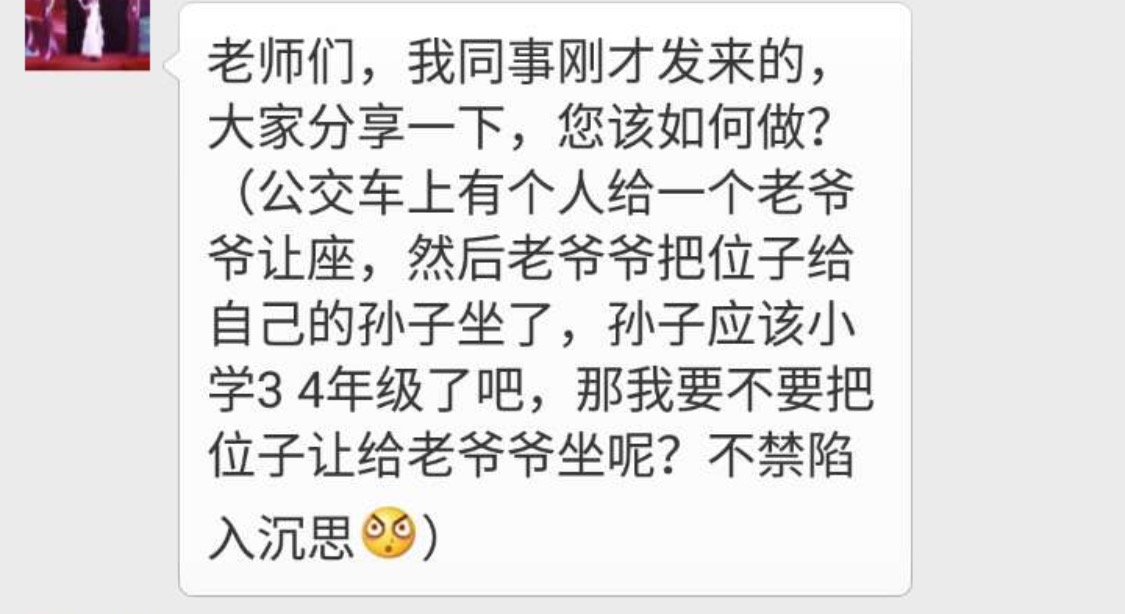 公交车上有个人给一个老爷爷让座,然后老爷爷把位子给自己的孙子坐了,孙子应该小学3 、4年级了吧,那我要不要把位子让给老爷爷坐呢?不禁陷入沉思。[发呆]