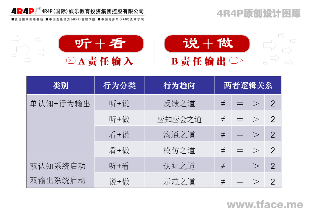 责任动力学的“听说看做”是责任4R8C管理的系统工程,针对责任认知与输出系统的各种问题,我们可以采用责任现象学数学逻辑关系核心体现在不等号、等号、大于号、加号等进行系统的分析与研究,最终目的就是帮助企业管理、青少年责任认知教育的规律性提高提供方法论。