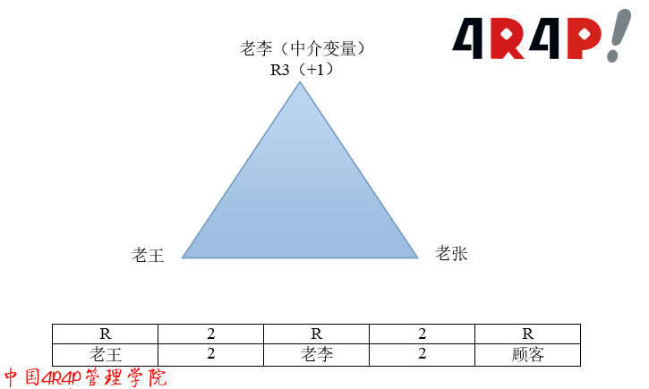 责任第三现象讲的是三个人R2R2R在特定的责任现象的规律,R2R2R中间的R为责任中介变量,两边的R会因为中间的R作为中介变量而发生高低阶变化, 或者中间R会因为两边的R高低阶变化而变化。比如托、媒婆、中介机构就属于R2R2R结构。老王卖瓜,老李作为朋友介绍给老张,并夸老王西瓜价廉物美,最 终,老王与老张成交,其责任现象学公式为:R=R1(0)2R3(+1) 2R1(0)