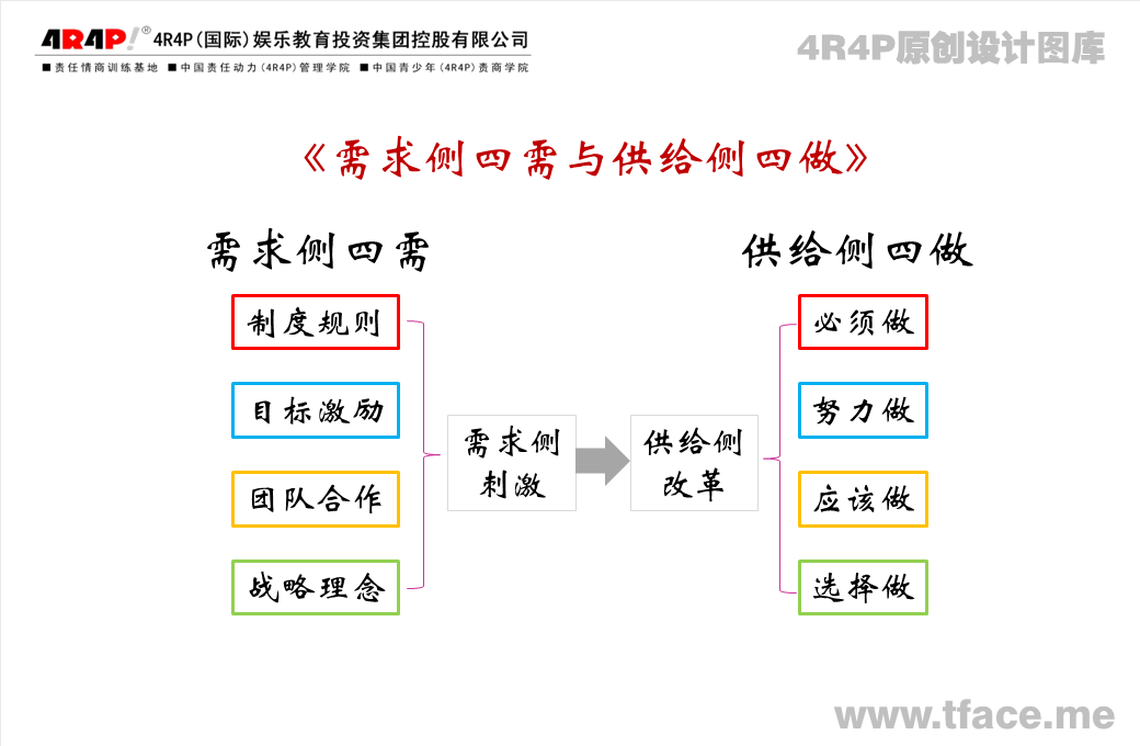 【责任动力供给侧结构分析】所谓人的责任动力供给侧结构调整包括四种结构要素:必须做、努力做、应该做、选择做的动力结构。有的人擅长努力做厌必须做,而有的人喜欢应该做厌努力做,长期以往每个人的责任动力供给结构会僵化,以至于无法适应岗位职责、分工、角色晋升的调整,因此需要进行责任动力供给侧结构分析调整,以满足组织或他人的需求侧结构的变化需求。企业需求侧结构包括四个要素:制度需要、目标需要、协同需要、战略需要。这个供给侧结构与需求侧结构的调整与匹配才是人的责任动力真实的内在规律奥秘!
