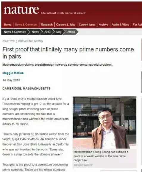 他的证明,给孪生素数猜想证明开一个真正的“头”。意思可以理解为,本来数学家在这个猜想里大海捞针,而他把大海变成了湖泊,还提供给别人继续缩小范围的方法,这让他获奖无数。